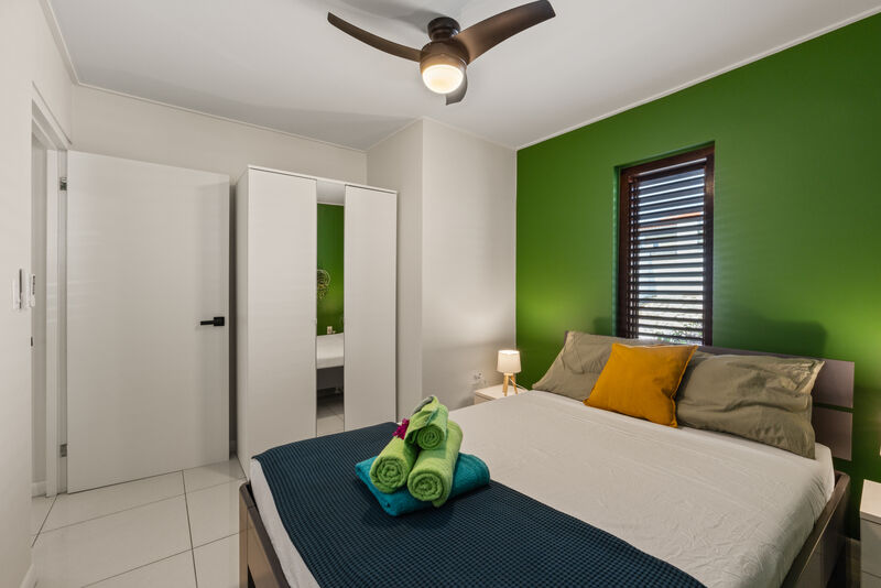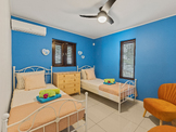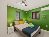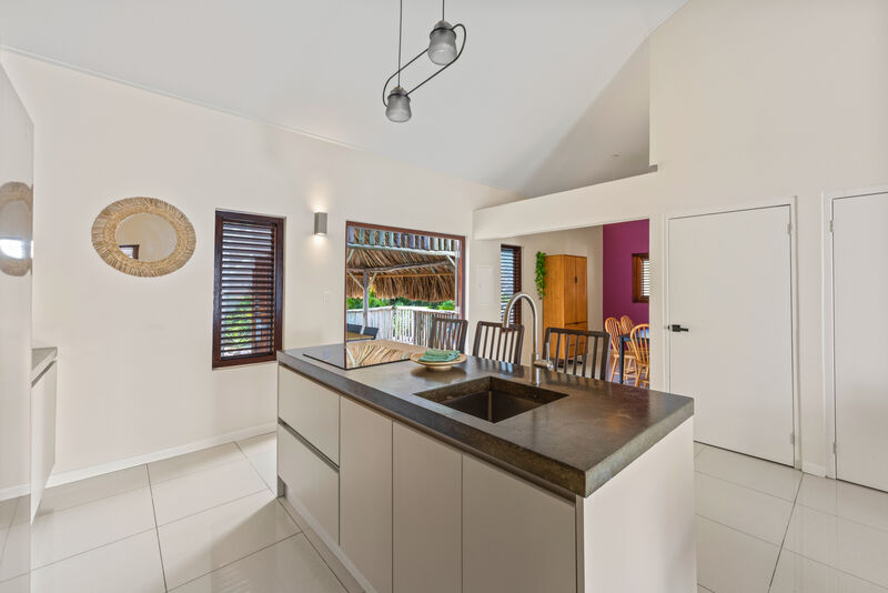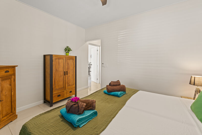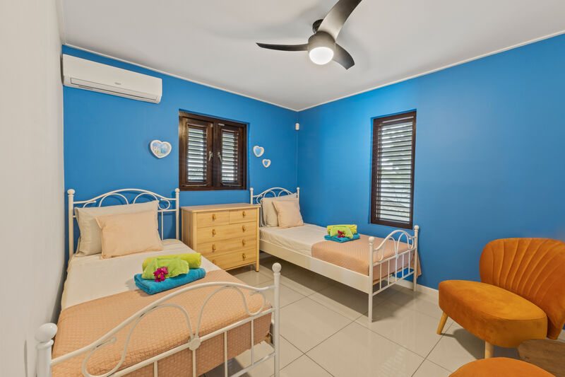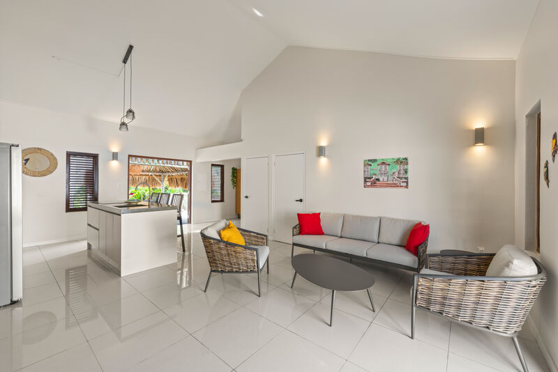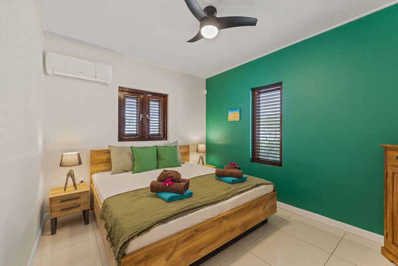 Inside, you will find cool bedrooms with air conditioning and fans, ensuring everyone gets a good night's sleep. For extra comfort, all windows are fitted with mosquito nets, allowing you to enjoy the gentle trade winds without unwanted visitors. The villa also features a fully equipped kitchen, high-speed Wi-Fi, and everything you need to feel right at home.