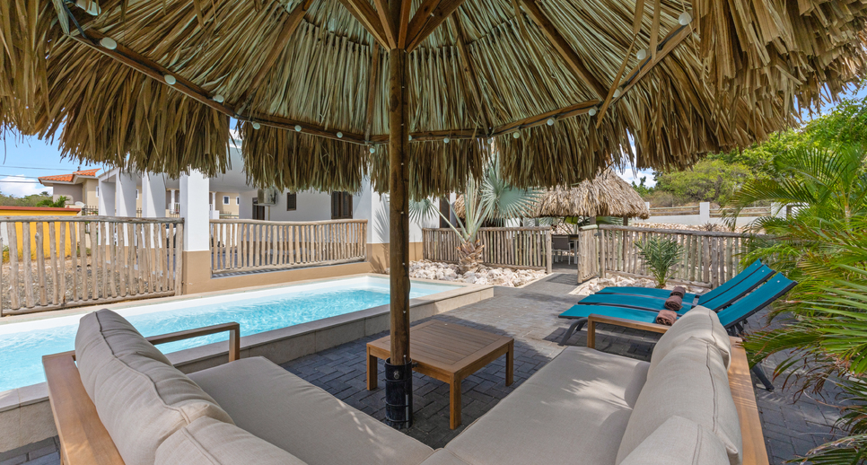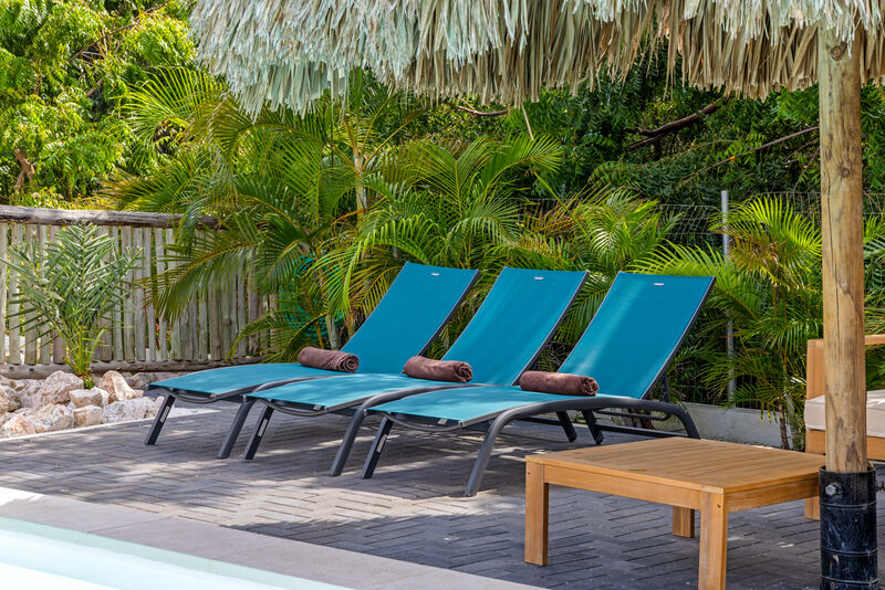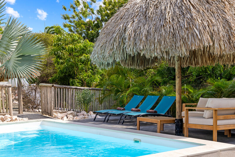 Start your day in the palapa, where you can enjoy breakfast with a view of the lush garden and the private pool. On warm evenings, the BBQ is ideal for cooking together and enjoying a cozy meal under the stars. By the pool, there are comfortable lounge chairs and a cozy seating area, perfect for relaxing, reading a good book, or simply soaking up the tropical atmosphere. The colorful tropical plants and palm trees give the garden a true Caribbean feel.